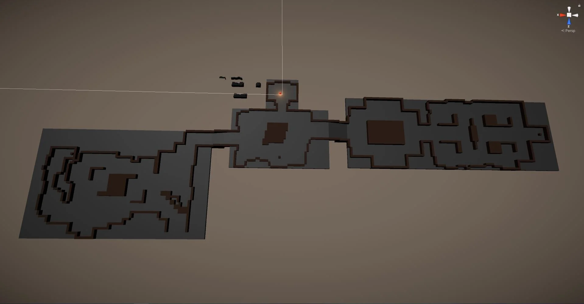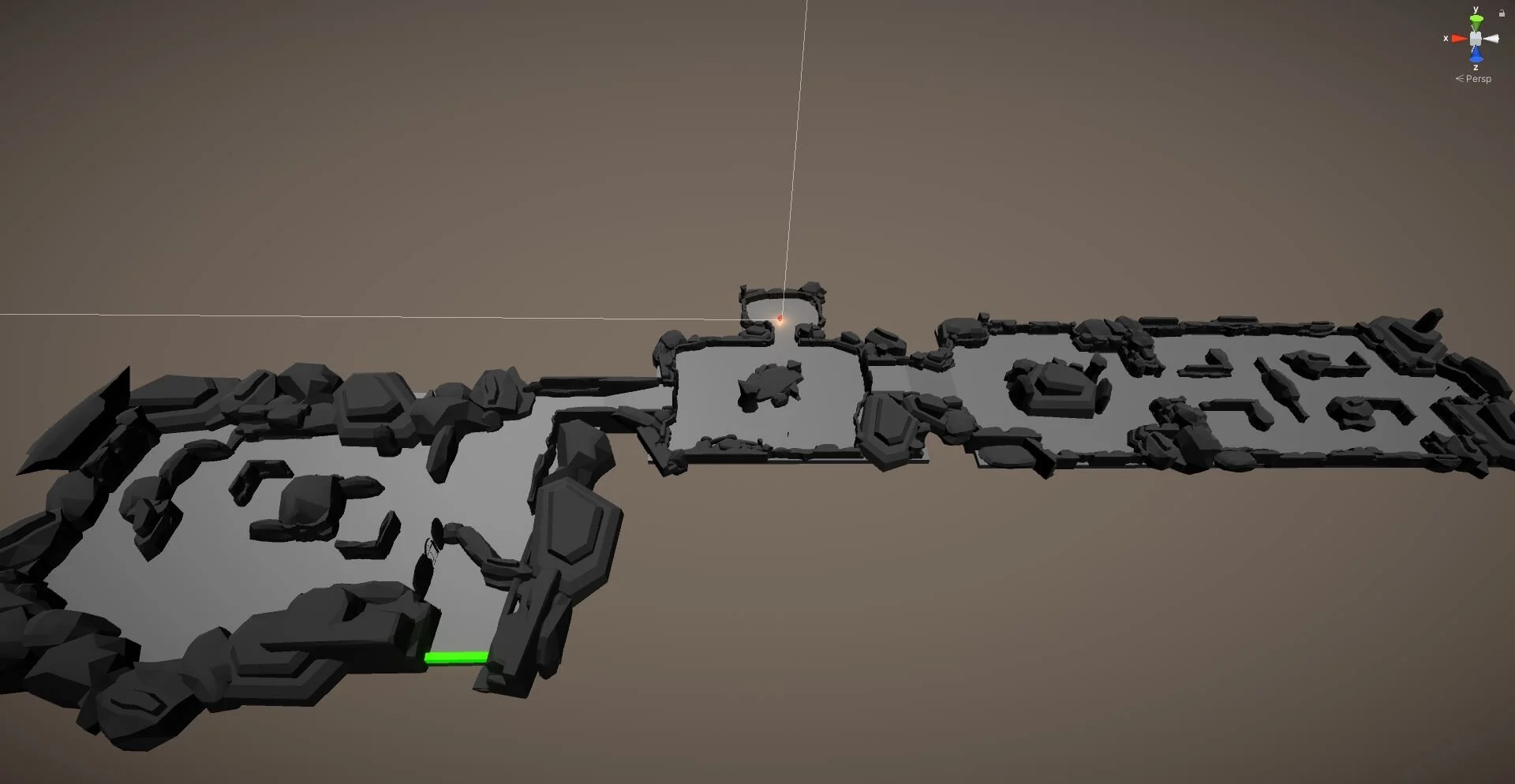 Since I was also one of the Level Designers, I created an annotated map for the first level that would act as a sort of tutorial level to introduce the player to this game. The first area (center) is to make sure the player would start in a safe environment to get used to the darkness around them and the controls of the character. Once they reach the first torch checkpoint, they will be able to accomplish two things: They can open the door to the next area once comfortable and they can send out a friend ember to scout ahead of them. One of the benefits of our focus on darkness and limited visibility was that I was able to focus mainly on just the layout and pacing of the player. Although, I did not want to accidently have our level look repetitive, so I spent a lot of time making sure that our rock assets were placed and adjusted distinctly enough so that players would not be confused by seeing two very similar rock structure placements.