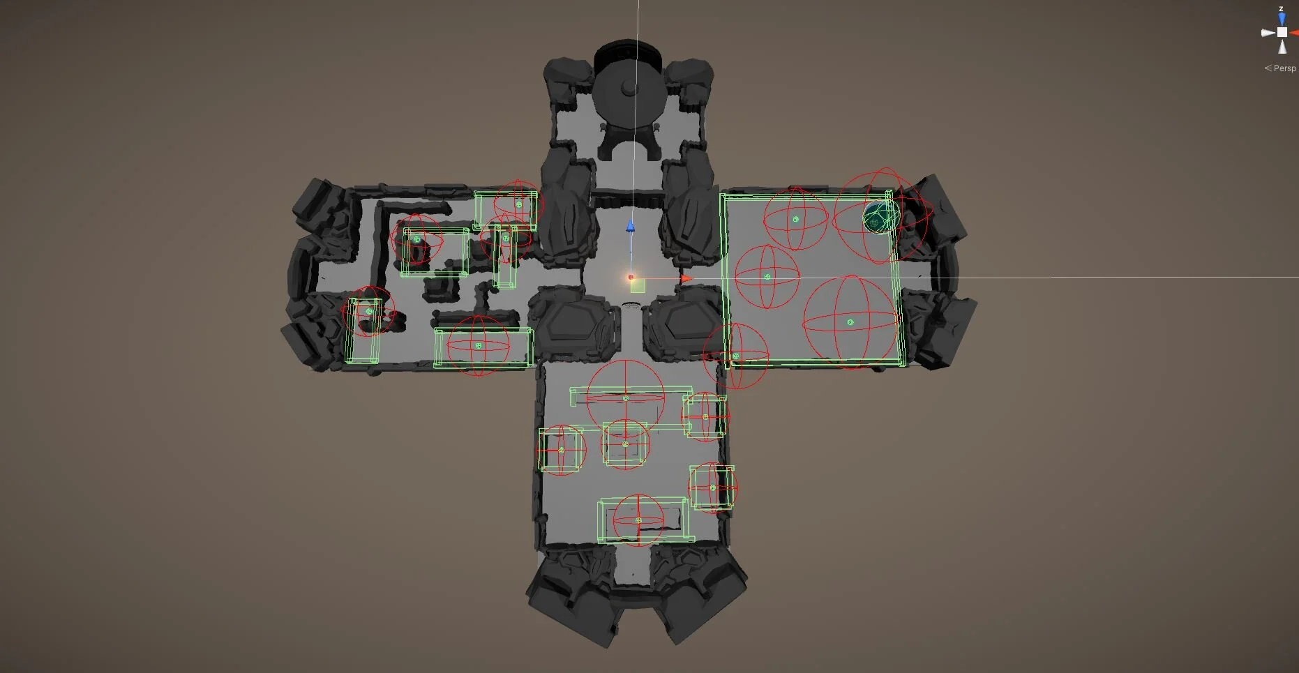 The final area (left) of the first level was a more natural area, where it is not an obvious “pick-a-path” layout and allows players to interweave through the different pathways. This is the “final test” of the players skills from the maze area to navigate and find out where the last torch and the exit are. This area allows the player to interact with the enemy AI behavior to see if they are able to outrun, outsmart or outmaneuver them, which our players after submission found quite enjoyable. We decided as a group to make the end very visible and obvious so that players would not reach the end and be fearful that there are more enemies ahead.