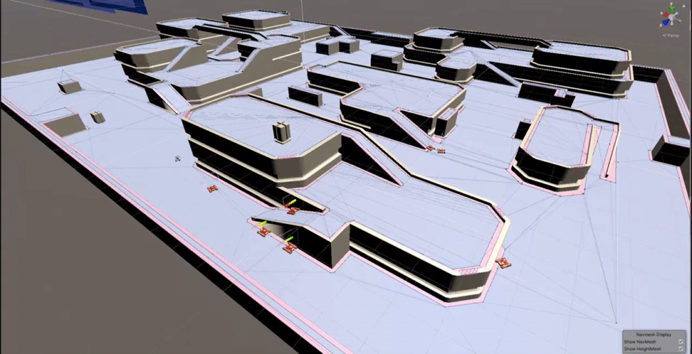 This is done through Unity's generated field of an objects mesh and factoring other objects height and radius. This generated field is what allows the enemy to move on and any area not allowed by the field does not let the enemy go through, for example a wall. Through experimenting and testing, Unity's feature seemed perfect for our game and we decided that I would take over the enemy AI programming and NavMesh aspect of the project.